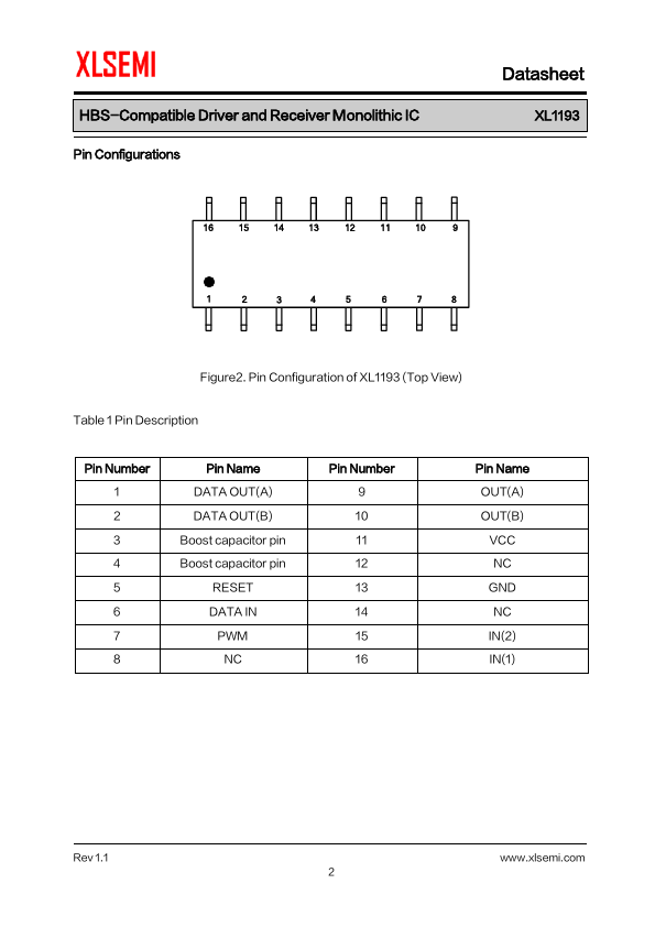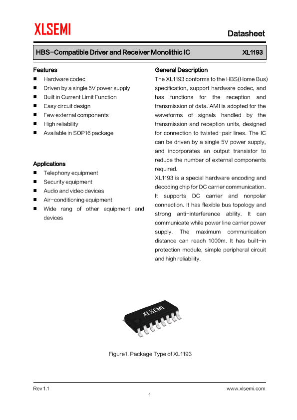 General Description The XL1193 conforms to the HBS(Home Bus) specification, support hardware codec, and has functions for the reception and transmission of data. AMI is adopted for the waveforms of signals handled by the transmission and reception units, designed for connection to...