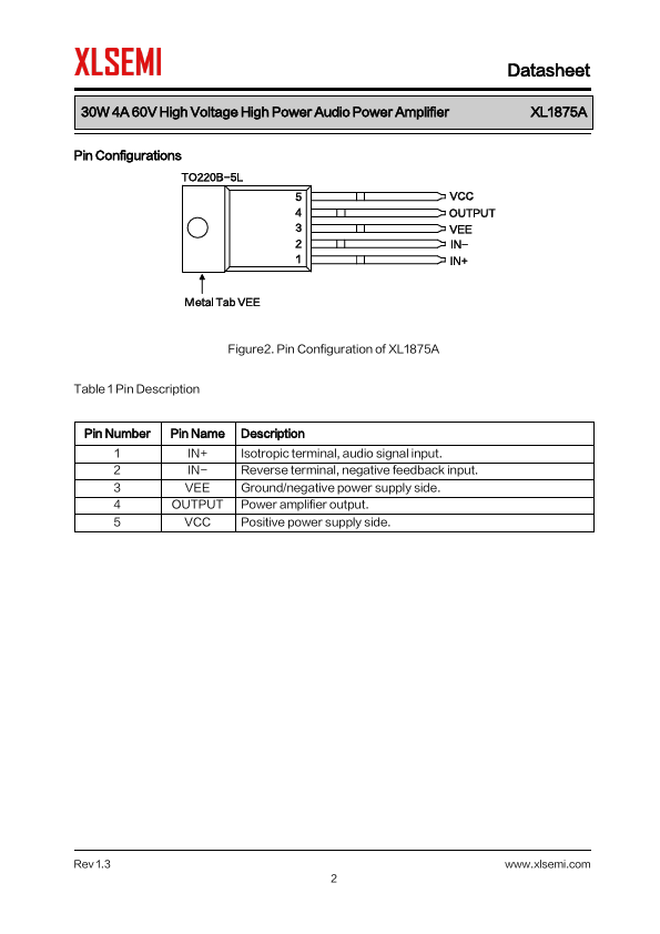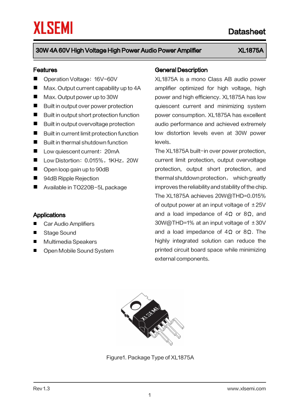 General Description XL1875A is a mono Class AB audio...