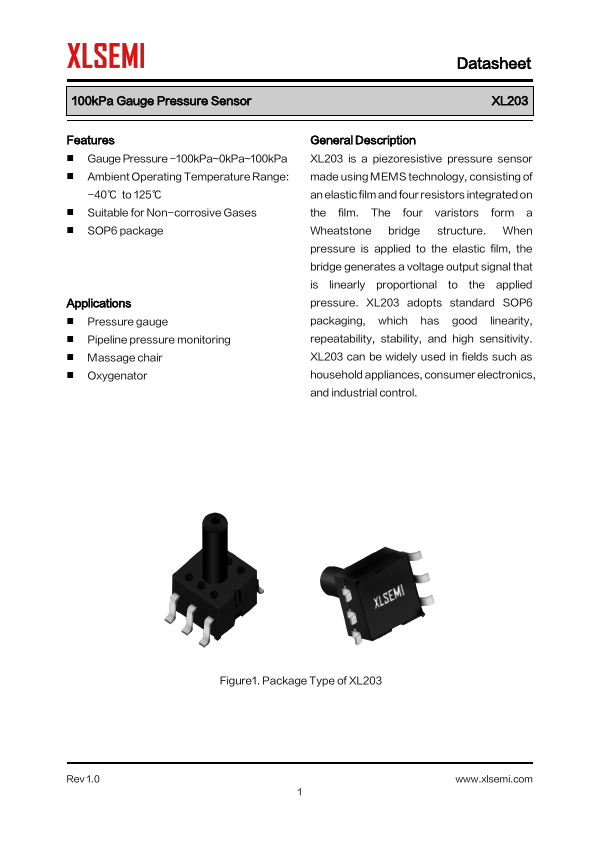 General Description XL203 is a piezoresistive pressure sensor made using MEMS technology, consisting of an elastic film and four resistors integrated on the film. The four varistors form a Wheatstone bridge structure. When pressure is applied to the elastic film, the bridge generates a voltage output signal that is linearly proportional to the applied pressure. XL203 adopts standard SOP6 packaging, which has...