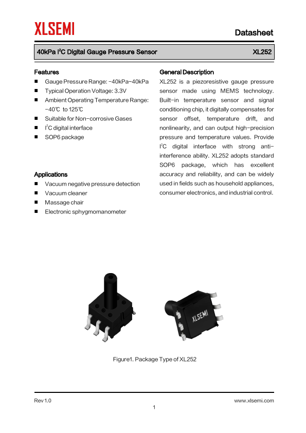 General Description XL252 is a piezoresistive gauge pressure sensor made using MEMS technology. Built-in temperature sensor and signal conditioning chip, it digitally pensates for sensor offset, temperature drift, and nonlinearity, and can output high-precision pressure and temperature values. Provide I2C digital...