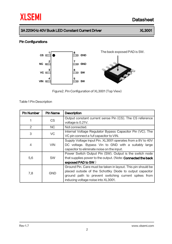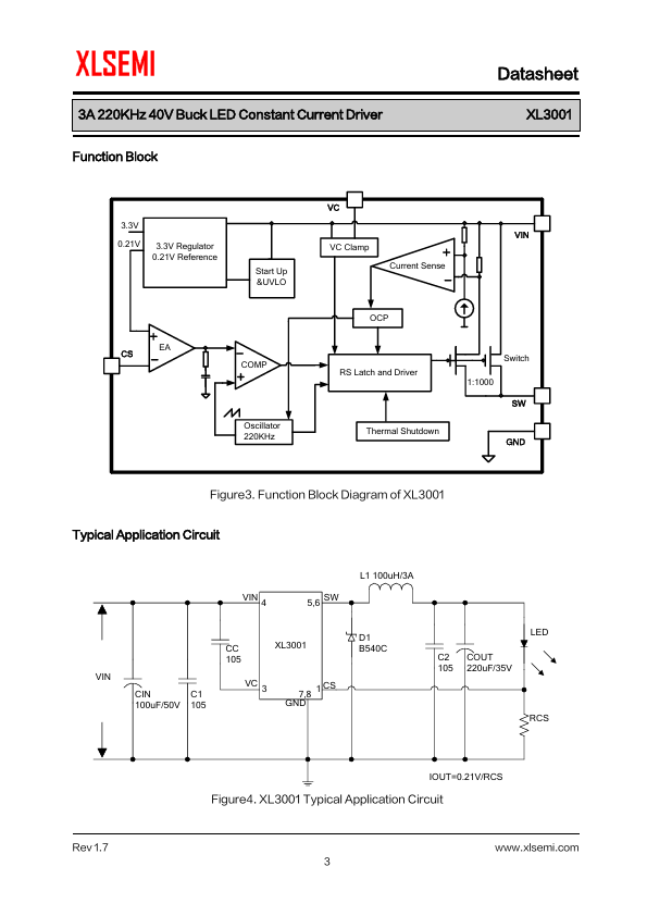 The XL3001 is a 220 KHz fixed frequency PWM buck (step-down) LED constant current driver, capable of driving a 3A load with high efficiency, low ripple and excellent line and load regulation.