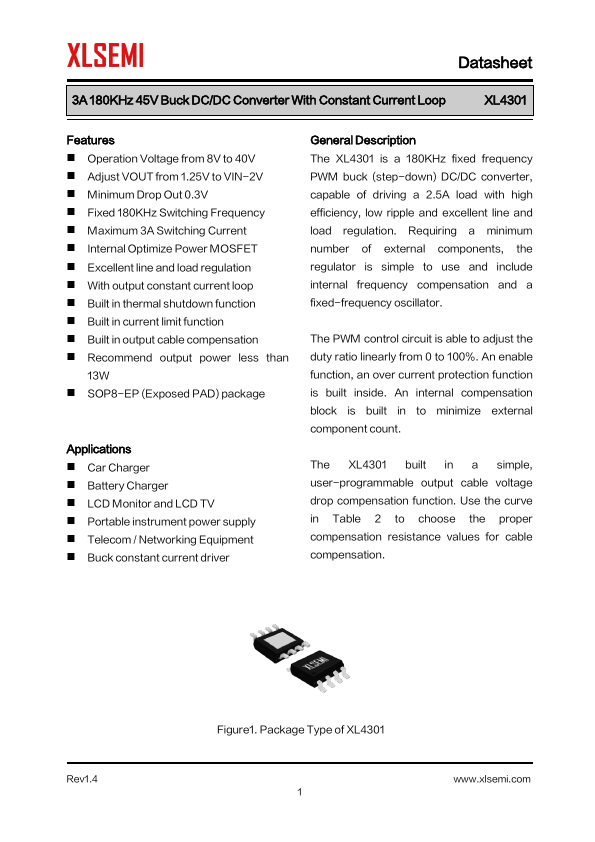 The XL4301 is a 180KHz fixed frequency PWM buck (step-down) DC/DC converter, capable of driving a 2.5A load with high efficiency, low ripple and excellent line and load regulation. Requiring a minimum number of external components, the regulator is simple to use and include internal frequency compensation and a fixed-frequency oscillator.