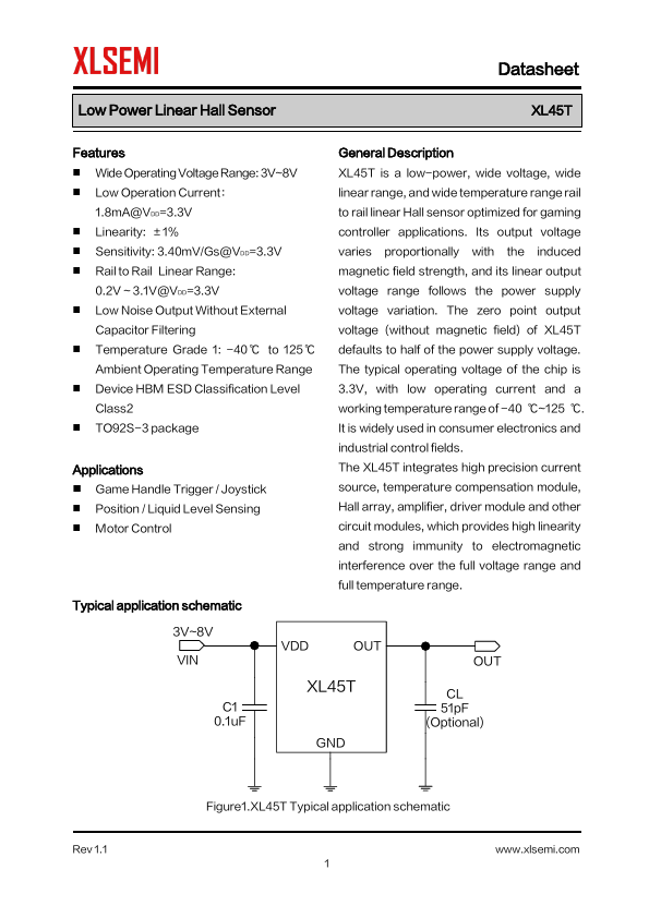 General Description XL45T is a low-power, wide voltage, wide linear range, and wide temperature range rail to rail linear Hall sensor optimized...