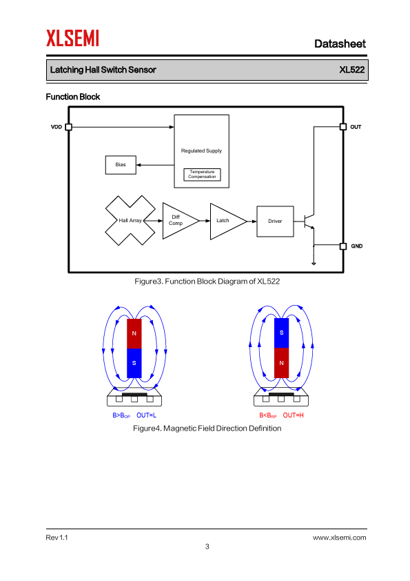 Latching Hall Switch Sensor Features - Wide Operating Voltage Range:3.3V~45V - Low Quiescent Current : 2.0mA - Device HBM ESD Classification Level Class3B - Reverse Supply Protection - Excellent Magnetic Field Symmetry - 40mA Load Capacity - SOT23-3 package - Magnetic Field Operate Point : 60Gs - Magnetic Field Release Point : -60Gs Applications - Power Tools - Flow Meters - Valve and Solenoid Status - Brushless DC Motors - Tachometers General Description The XL522 is a latching Hall switch sensor that optimized for wide voltage, low quiescent current and wide temperature range. XL522 supports a power supply voltage of up to 50V and provide a load capacity of up to...