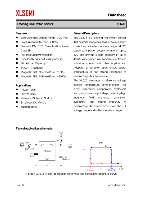 General Description The XL525 is a latching Hall switch sensor that optimized for wide voltage, low quiescent current and wide temperature range. XL525 supports a power supply voltage of up to 50V and provide a load capacity of up to...