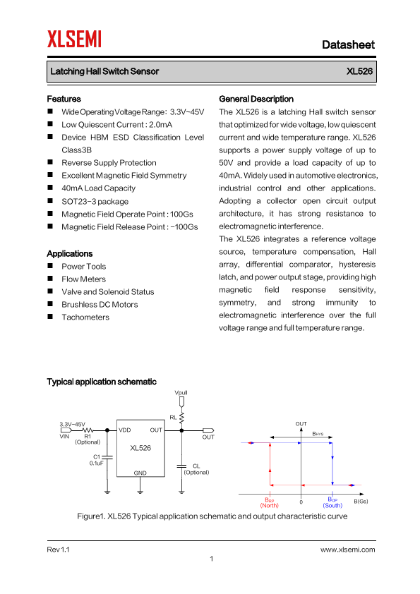 General Description The XL526 is a latching Hall switch sensor that optimized for wide voltage, low quiescent current and wide temperature range. XL526 supports a power supply voltage of up to 50V and provide a load capacity of up to...