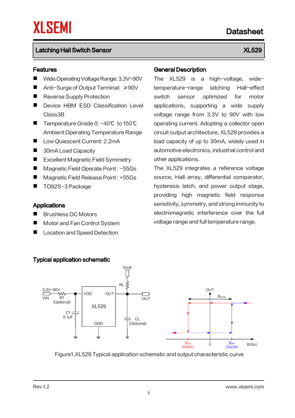 General Description The XL529 is a high-voltage, widetemperature-range latching Hall-effect switch sensor optimized for motor...