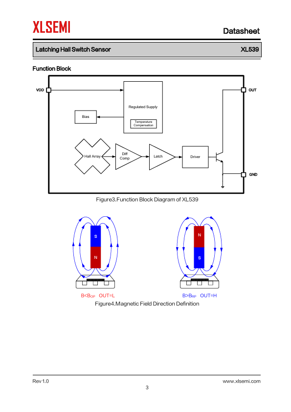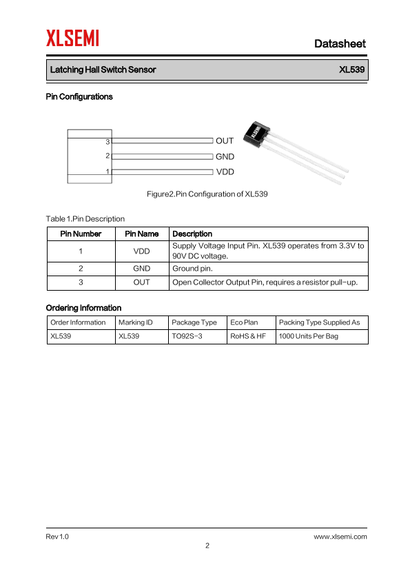 General Description The XL539 is a high-voltage, widetemperature-range latching Hall-effect switch sensor optimized for motor...