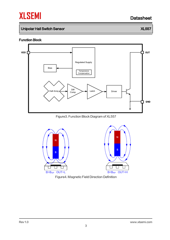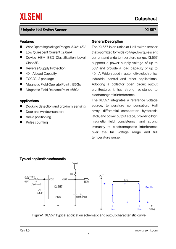 General Description The XL557 is an unipolar Hall switch sensor that optimized for wide voltage, low quiescent current and wide temperature range. XL557 supports a power supply voltage of up to 50V and provide a load capacity of up to 40mA. Widely used in...