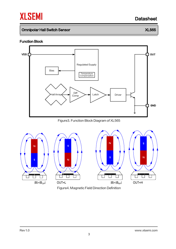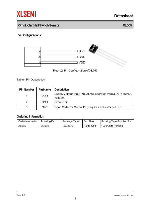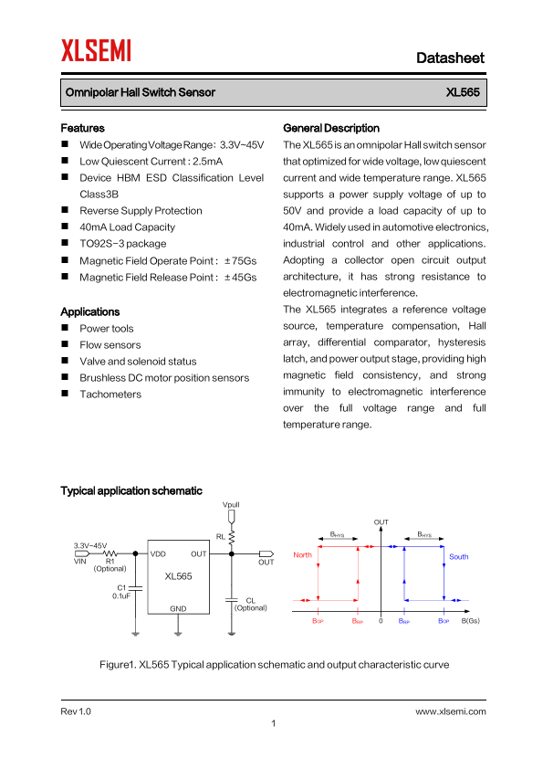General Description The XL565 is an omnipolar Hall switch sensor that optimized for wide voltage, low quiescent current and wide temperature range. XL565 supports a power supply voltage of up to 50V and provide a load capacity of up to 40mA. Widely used...