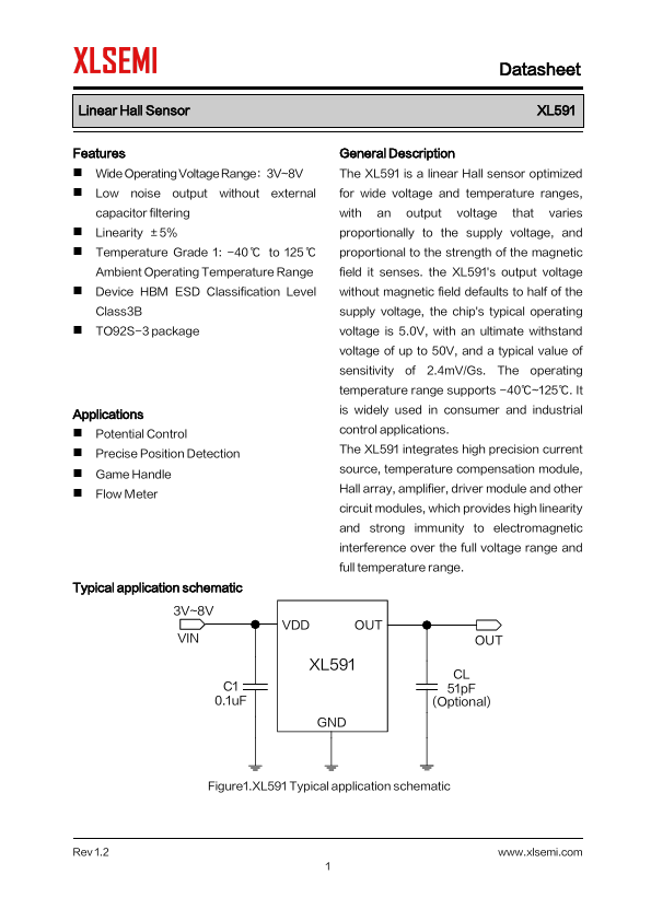 The XL591 is a linear Hall sensor optimized for wide voltage and temperature ranges, with an output voltage that varies proportionally to the supply voltage, and proportional to the strength of the magnetic field it senses. the XL591's output voltage without magnetic field defaults to half of the supply voltage, the chip's typical operating voltage is 5.0V, with an ultimate withstand voltage of up to 50V, and a typical value of sensitivity of 2.4m V/Gs. The operating temperature range supports -40℃~125℃. It is widely used in consumer and industrial control applications. The XL591 integrates high...