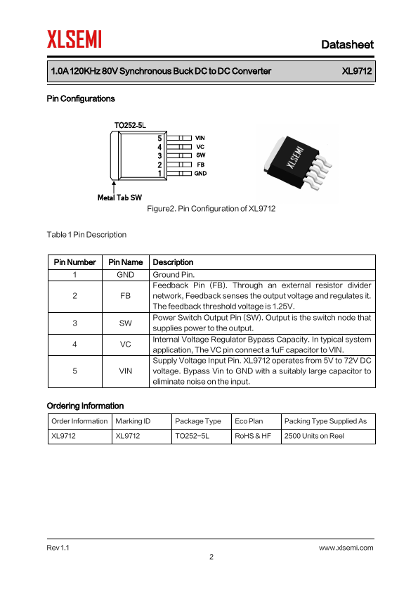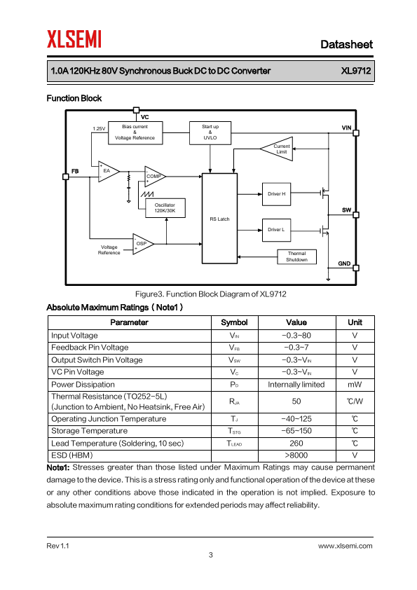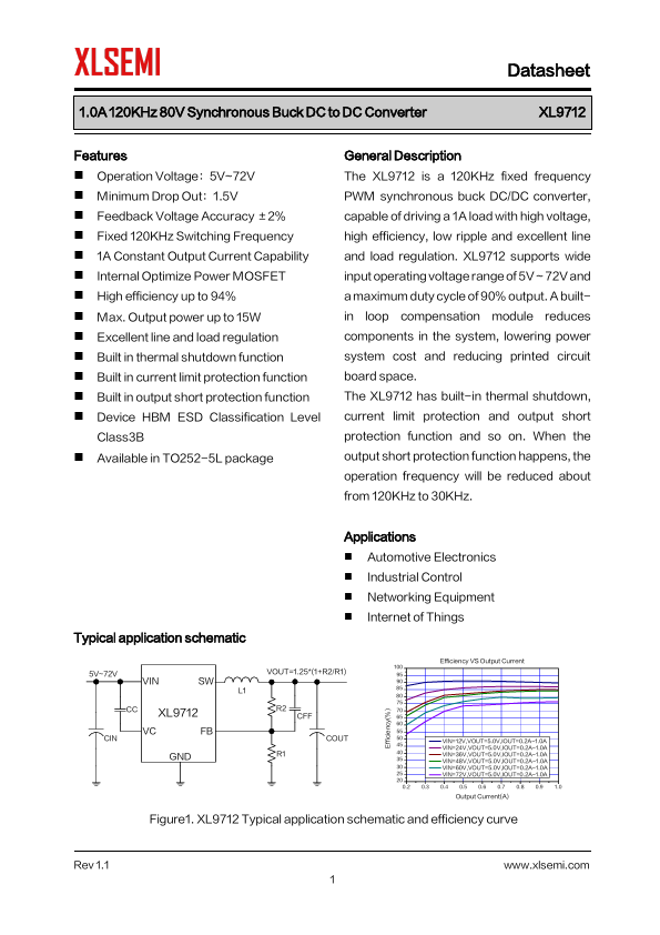 General Description The XL9712 is a 120KHz fixed frequency PWM synchronous buck DC/DC converter, capable of driving a 1A load...