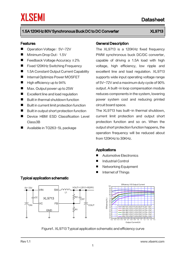 General Description The XL9713 is a 120KHz fixed frequency PWM synchronous buck DC/DC converter, capable of driving a 1.5A...