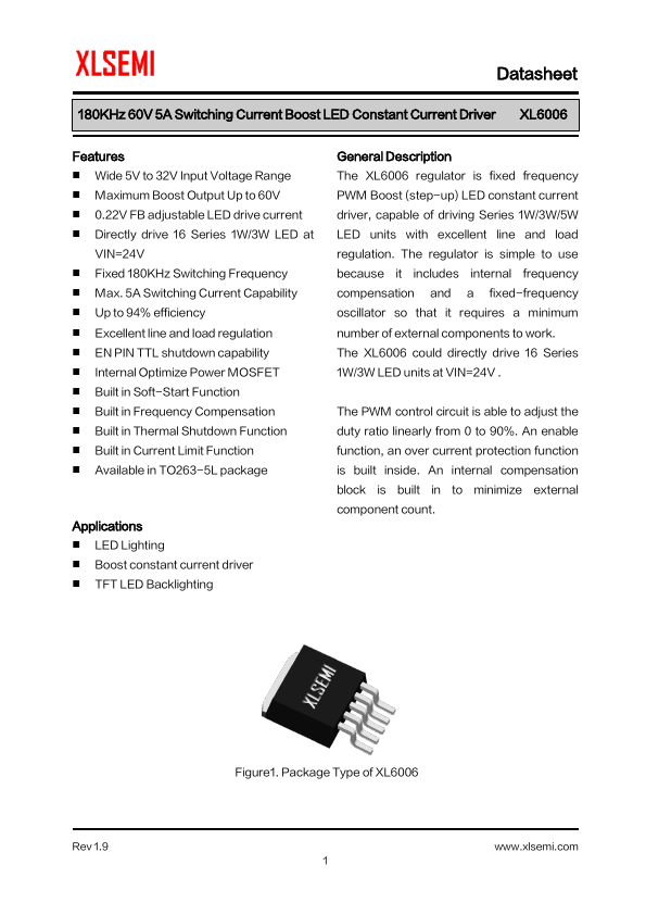 The XL6006 regulator is fixed frequency PWM Boost (step-up) LED constant current driver, capable of driving Series 1W/3W/5W LED units with excellent line and load regulation. The regulator is simple to use because it includes internal frequency compensation and a fixed-frequency oscillator so that it requires a minimum number of external components to work.
