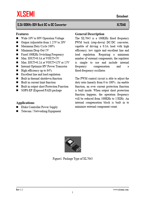 The XL7045 is a 100KHz fixed frequency PWM buck (step-down) DC/DC converter, capable of driving a 0.3A load with high efficiency, low ripple and excellent line and load regulation. Requiring a minimum number of external ponents, the regulator is simple to use and include internal frequency pensation and a fixed-frequency oscillator.