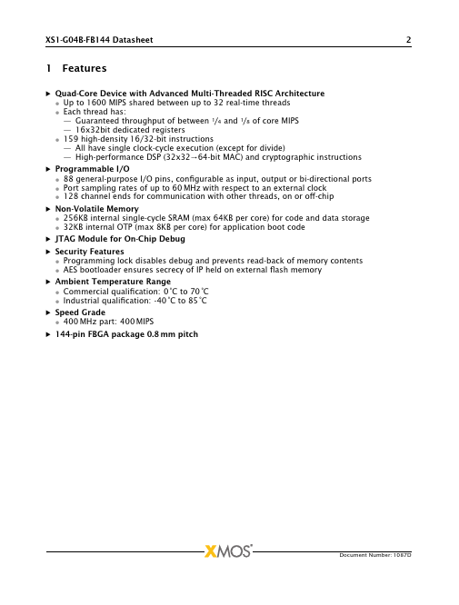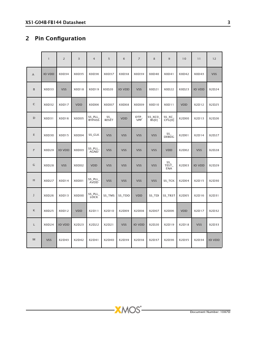 Module Power PLL JTAG XCore 0 I/O Signal Function Type Active Properties PU=Pull Up, PD=Pull Down, ST=Schmitt Trigger, OT=Output Tristate, S=Switchable VDD RS=Required for SPI boot (§5.8), RU=Required for USB-enabled devices (§10) Digital core power PWR VSS Digital ground GND IO VDD Digital I/O power PWR SS_PLL_AGND Analog ground for PLL GND SS_PLL_AVDD Analog PLL power PWR OTP_VPP OTP programming voltage PWR SS_.