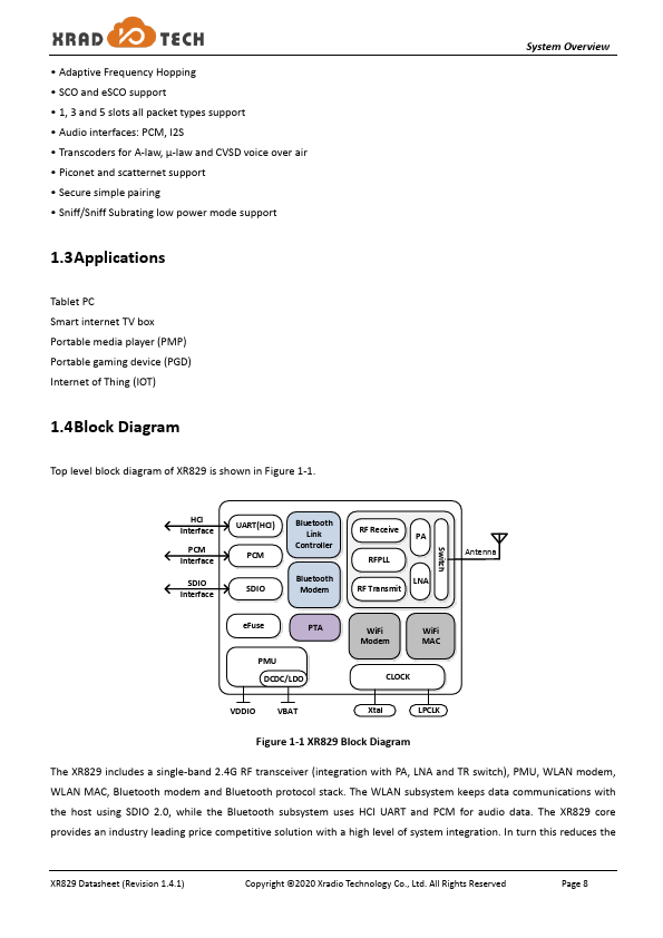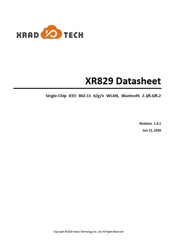 This scope of document is to provide a specification of XR829 Wireless LAN SoC, it will be used by the system/design/development teams to detail the design requirements. XR829 is a fully integrated SoC to support 2.4G WLAN 802.11 b/g/n and Bluetooth 2.1+EDR/4.2. It is optimized for mobile applications such as PDAs and portable media players.