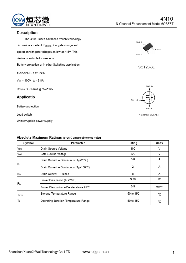 | 4N10 | N-Channel MOSFET Transistor | |