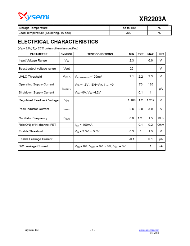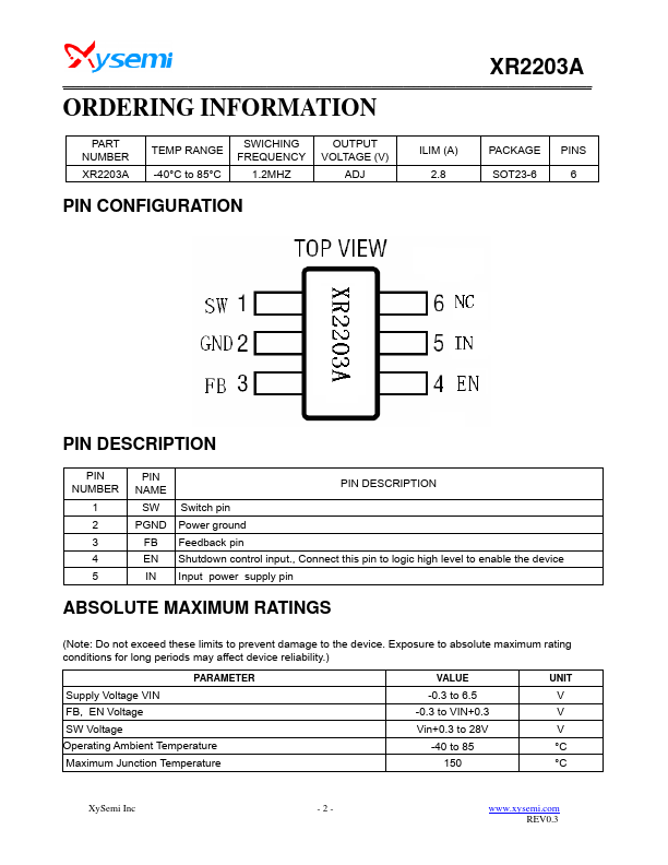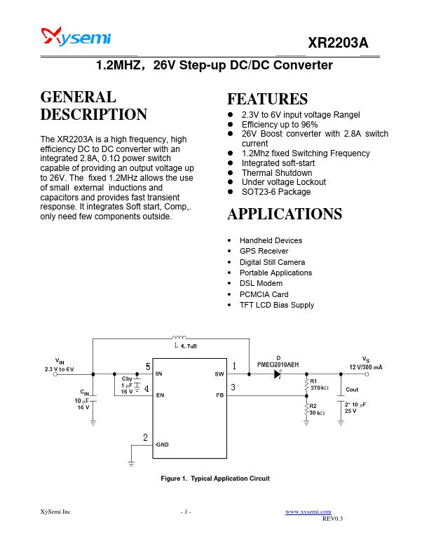 The XR2203A is a high frequency, high efficiency DC to DC converter with an integrated 2.8A, 0.1Ω power switch capable of providing an output voltage up to 26V. The fixed 1.2MHz allows the use of small external inductions and capacitors and provides fast transient response. It integrates Soft start, p,.