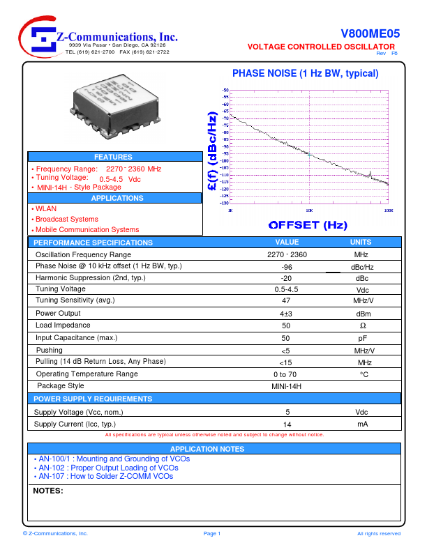 9939 Via Pasar San Diego, CA 92126 TEL (619) 621-2700 FAX (619) 621-2722 V800ME05 VOLTAGE CONTROLLED OSCILLATOR Rev F6 PHASE NOISE (1 Hz BW,.