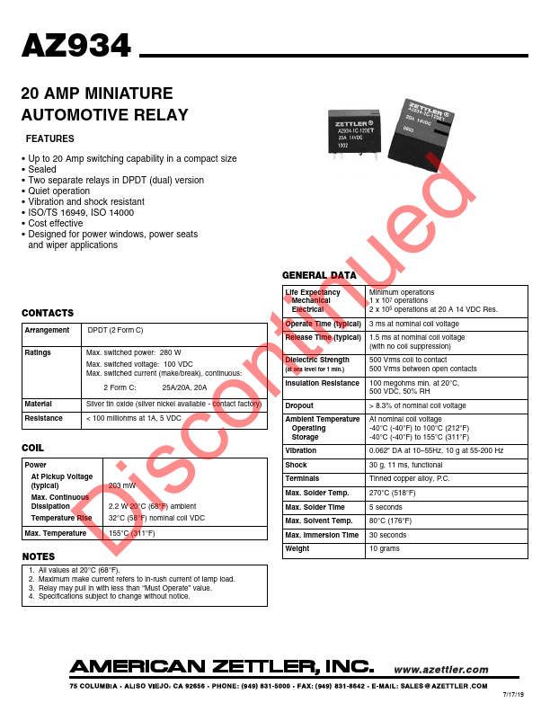 AZ934 20 AMP MINIATURE AUTOMOTIVE RELAY.