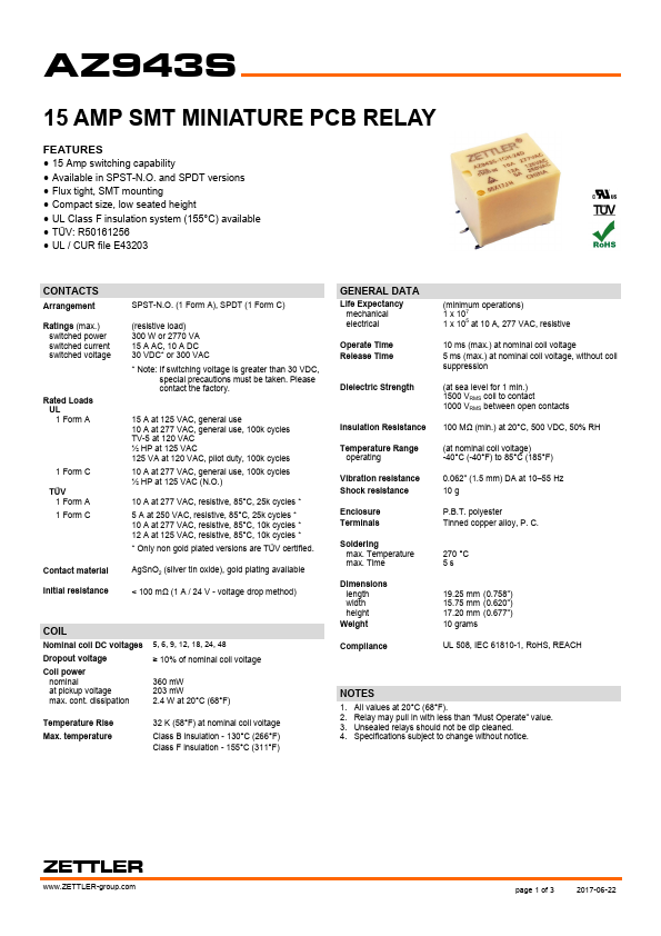 Zettler Logo AZ943 15 AMP MINIATURE PCB RELAY Zettler