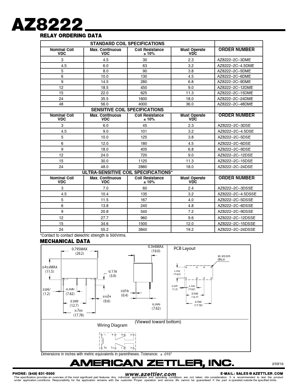 AZ8222 SUBMINIATURE ULTRA-SENSITIVE DIP RELAY.