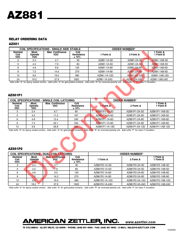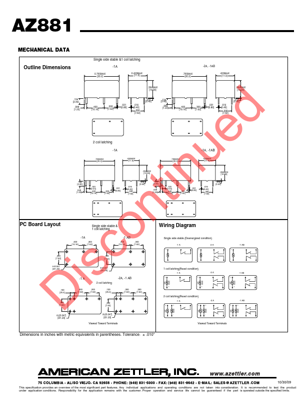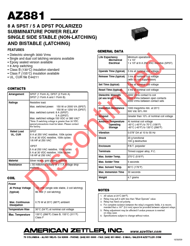 AZ881 8 A SPST / 5 A DPST POLARIZED SUBMINIATURE POWER RELAY SINGLE SIDE STABLE (NON-LATCHING) AND BISTABLE (LATCHING).