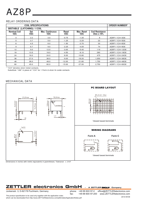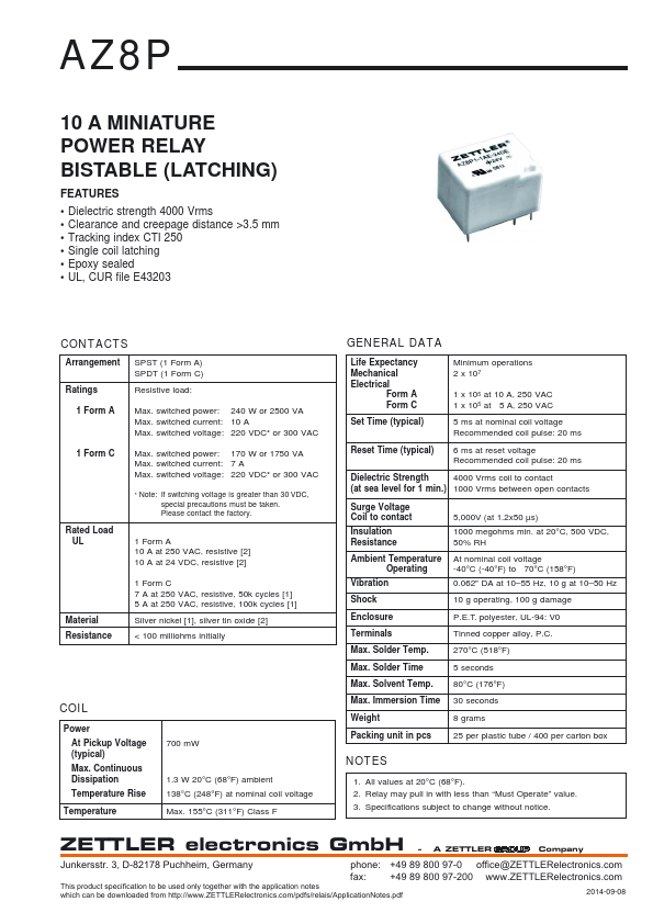 AZ8P 10 A MINIATURE POWER RELAY BISTABLE (LATCHING).