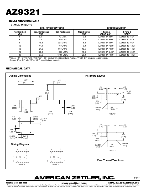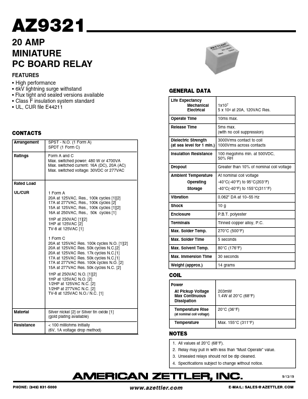 AZ9321 20 AMP MINIATURE PC BOARD RELAY.