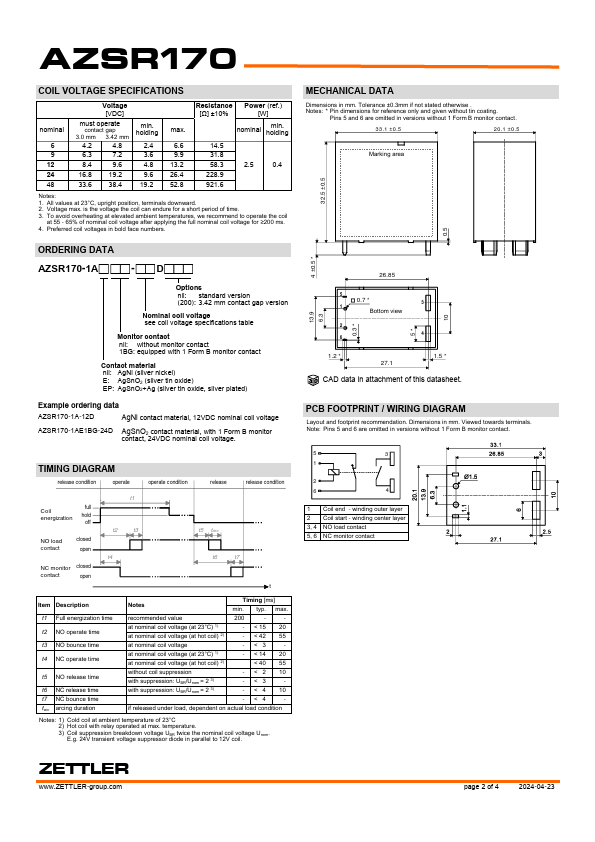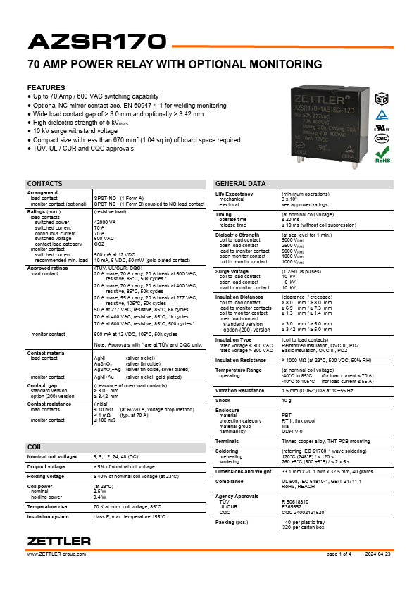 AZSR170 70 AMP POWER RELAY WITH OPTIONAL MONITORING.