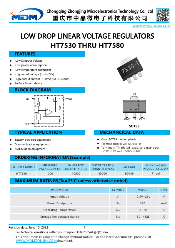 Chongqing Zhongjing Microelectronics Technology Co., Ltd 重庆市中晶微电子科技有限公司 .MDMZONJIN. LOW DROP LINEAR VOLTAGE REGULATORS HT7530 THRU HT7580.