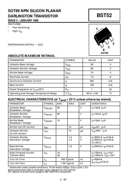 BST52 | 80V NPN SILICON PLANAR DARLINGTON TRANSISTOR | Diodes |