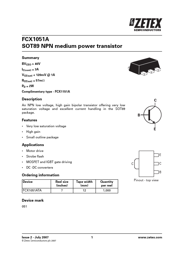 Overview: FCX1051A SOT89 NPN medium power transistor Summary BVCEO > 40V IC(cont) = 3A VCE(sat) < 120mV @ 1A RCE(sat) = 57m⍀ PD = 2W plimentary type -.