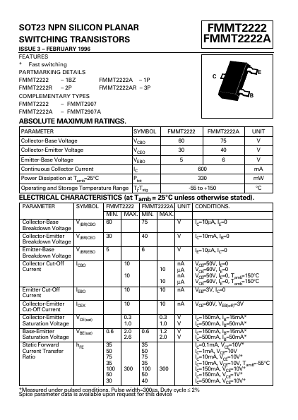 SOT23 NPN SILICON PLANAR SWITCHING TRANSISTORS FMMT2222 FMMT2222A ISSUE 3 FEBRUARY.