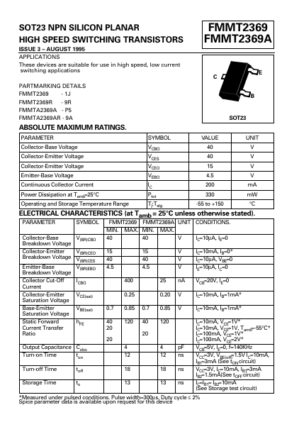 SOT23 NPN SILICON PLANAR HIGH SPEED SWITCHING TRANSISTORS FMMT2369 FMMT2369A ISSUE 3 AUGUST 1995 APPLICATIONS These devices are suitable for use in high speed, low current switching applications E.