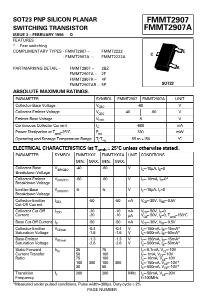 SOT23 PNP SILICON PLANAR SWITCHING TRANSISTOR ISSUE 3 FEBRUARY 1996.