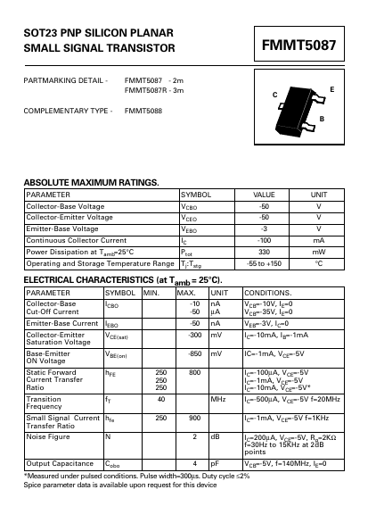 Overview: SOT23 PNP SILICON PLANAR SMALL SIGNAL TRANSISTOR PARTMARKING DETAIL - FMMT5087 - 2m FMMT5087R - 3m COMPLEMENTARY TYPE - FMMT5088 FMMT5087 E C B ABSOLUTE MAXIMUM RATINGS.