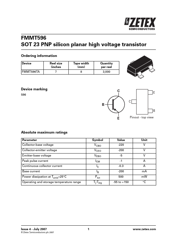 Overview: FMMT596 SOT 23 PNP silicon planar high voltage transistor Ordering information Device FMMT596TA Reel size (inches 7 Tape width (mm) 8 Quantity per reel 3,000 Device marking 596 C E C B B E Pinout -.