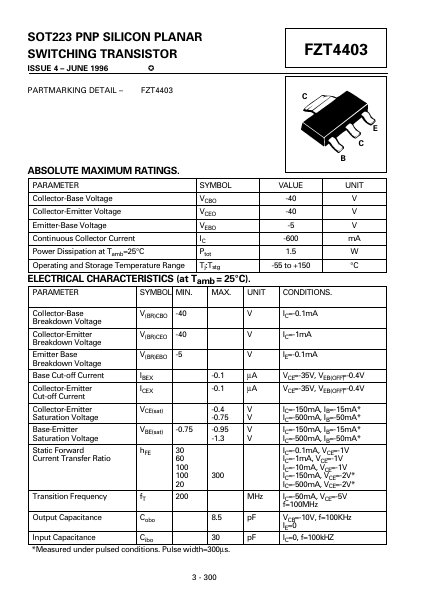 Overview: SOT223 PNP SILICON PLANAR SWITCHING TRANSISTOR ISSUE 4 JUNE 1996 7 PARTMARKING DETAIL FZT4403 FZT4403 C E C B ABSOLUTE MAXIMUM RATINGS.