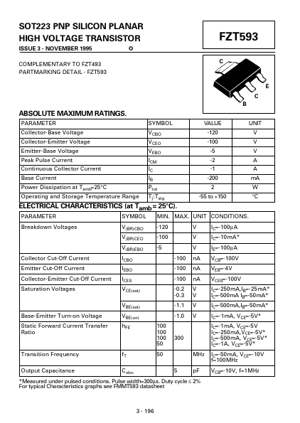 Overview: SOT223 PNP SILICON PLANAR HIGH VOLTAGE TRANSISTOR ISSUE 3 - NOVEMBER 1995 7 COMPLEMENTARY TO FZT493 PARTMARKING DETAIL - FZT593 FZT593 C E ABSOLUTE MAXIMUM RATINGS.