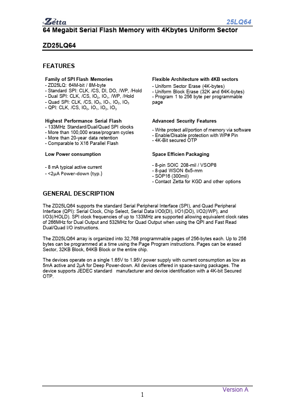 Flexible Architecture with 4KB sectors - Uniform Sector Erase (4K-bytes) - Uniform Block Erase (32K and 64K-bytes) - Program 1 to 256 byte per programmable page Advanced Security.