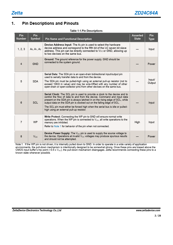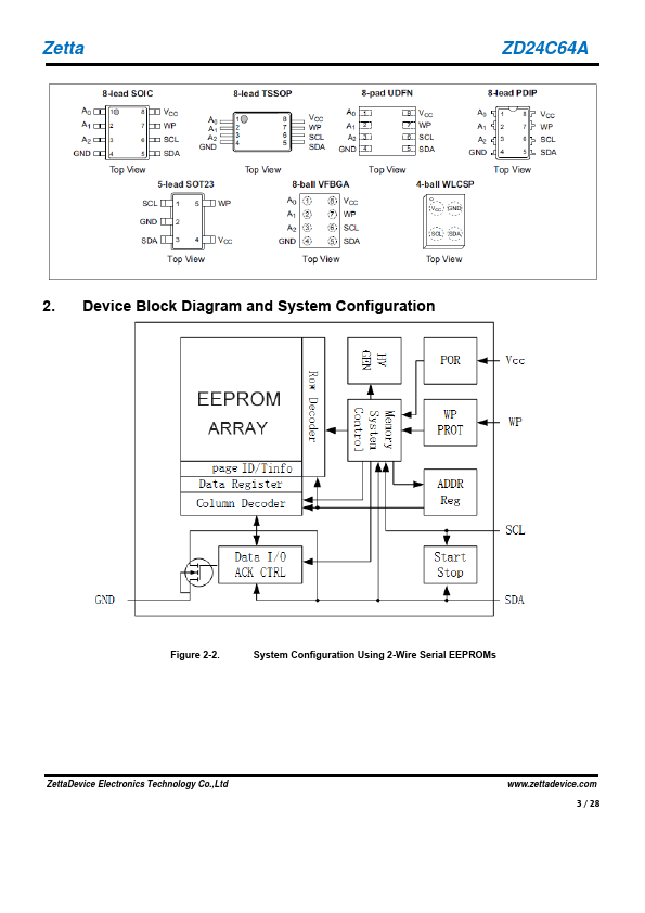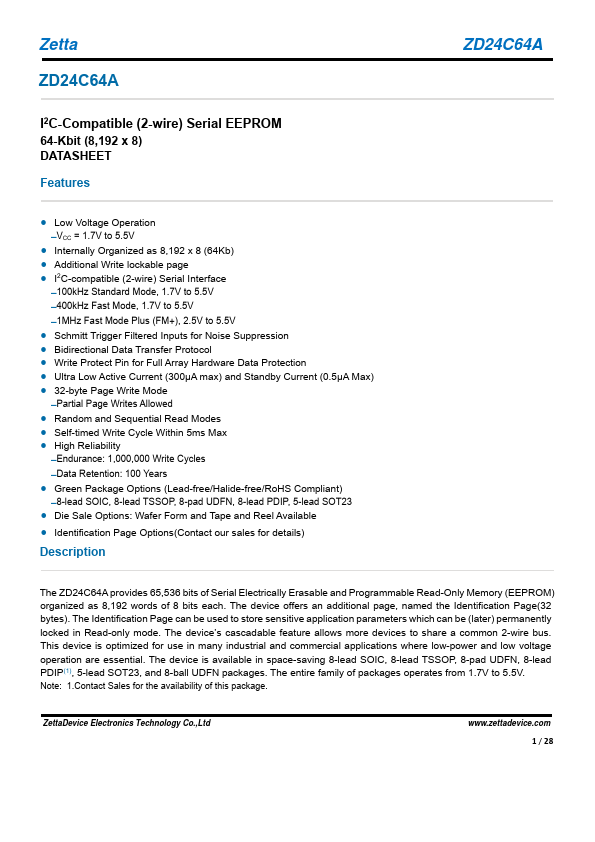 The ZD24C64A provides 65,536 bits of Serial Electrically Erasable and Programmable Read-Only Memory (EEPROM) organized as 8,192 words of 8 bits each. The device offers an additional page, named the Identification Page(32 bytes). The Identification Page can be used to store sensitive application parameters which can be (later) permanently locked in Read-only mode.