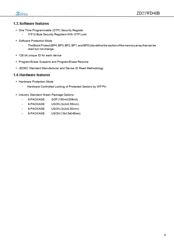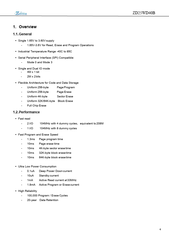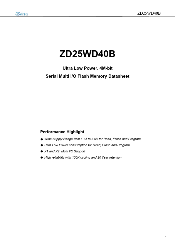 The ZD25WD40B is a serial interface Flash memory device designed for use in a wide variety of high-volume consumer based applications in which program code is shadowed from Flash memory into embedded or external RAM for execution. The flexible erase architecture of the device, with its page erase granularity it is ideal for data storage as well, eliminating the need for additional data storage devices. The erase...