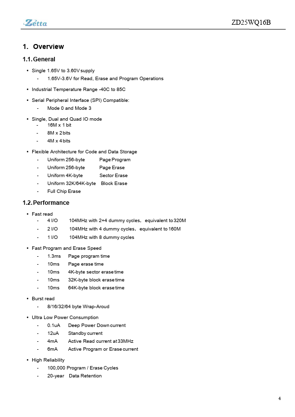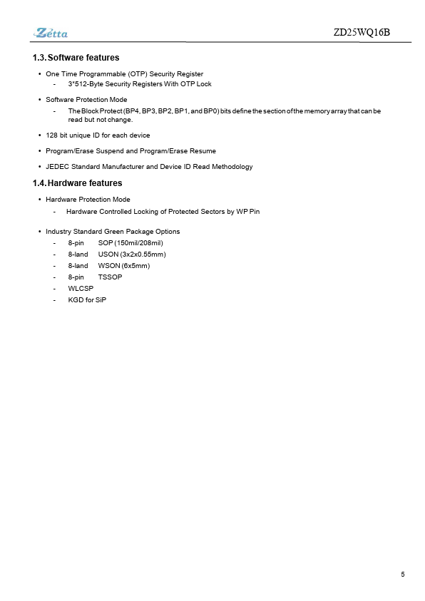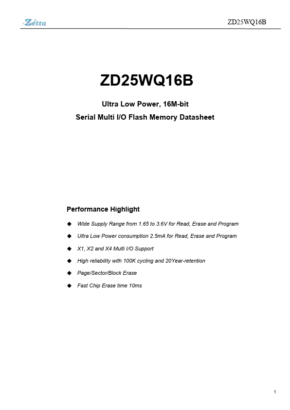 The ZD25WQ16B is a serial interface Flash memory device designed for use in a wide variety of high-volume consumer based applications in which program code is shadowed from Flash memory into embedded or external RAM for execution. The flexible erase architecture of the device, with its page erase granularity it is ideal for data storage as well, eliminating the need for additional data storage devices. The erase...