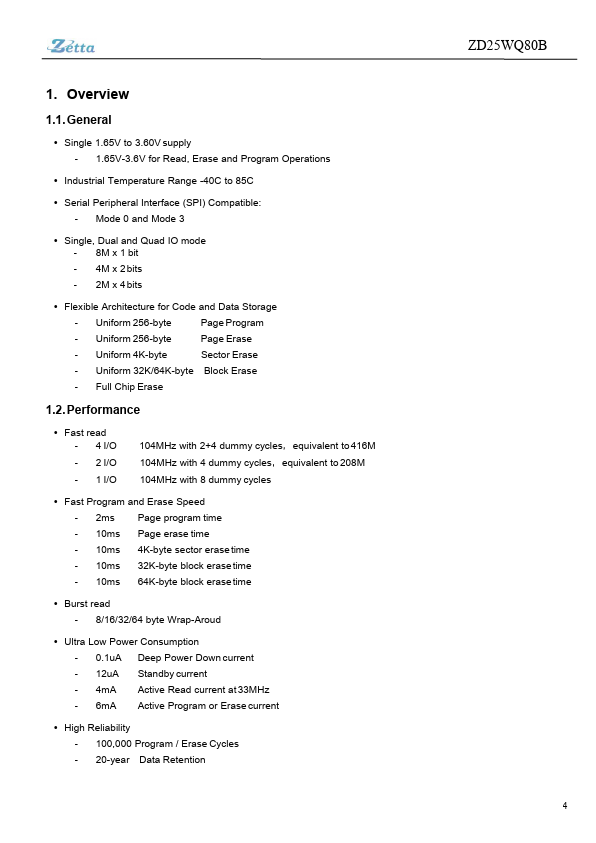 The ZD25WQ80B is a serial interface Flash memory device designed for use in a wide variety of high-volume consumer based applications in which program code is shadowed from Flash memory into embedded or external RAM for execution. The flexible erase architecture of the device, with its page erase granularity it is ideal for data storage as well, eliminating the need for additional data storage devices. The erase...