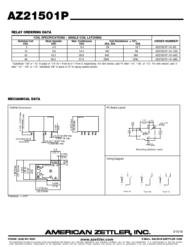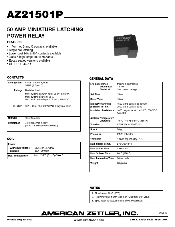 AZ21501P 50 AMP MINIATURE LATCHING POWER RELAY.