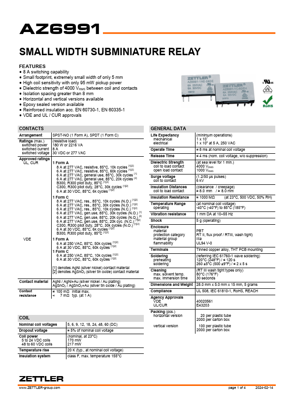 AZ6991 SMALL WIDTH SUBMINIATURE RELAY.