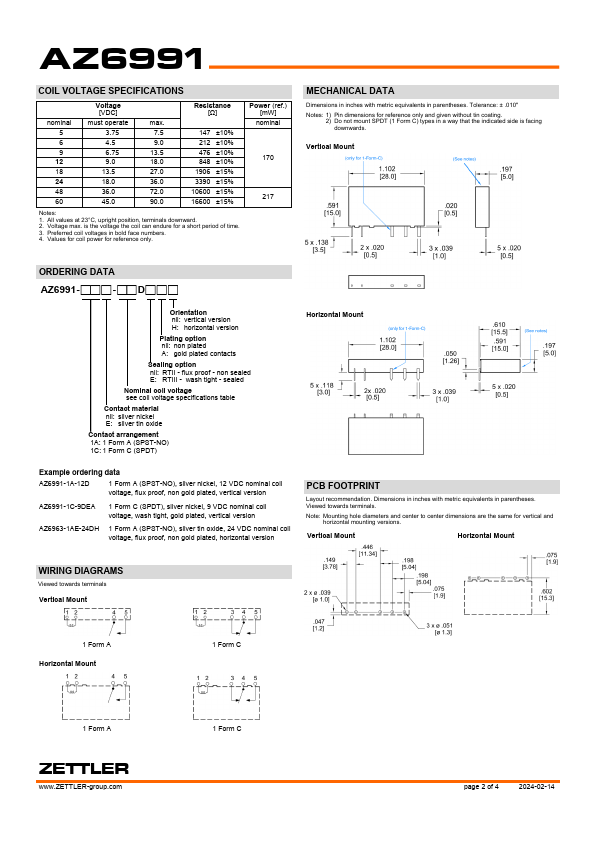 - Dielectric strength of 4000 VRMS between coil and contacts