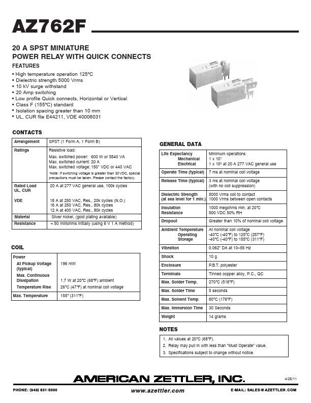 AZ762F 20 A SPST MINIATURE POWER RELAY WITH QUICK CONNECTS.